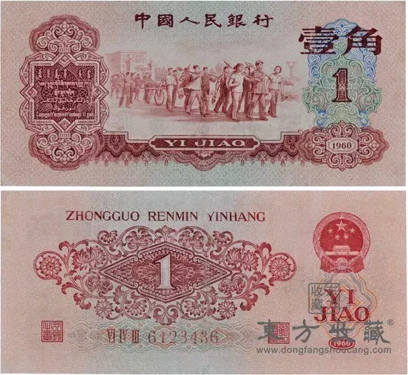 该币是1960年版一角券,纸张质量好,工艺精湛,色调明快,深受收藏者青睐,自1971年退出流通领域以来,也在收藏市场聚集了一定的人气,尤其是96年邮币卡三驾马车并行时,它也和背绿水印一样,价格居高不下,上扬势头强劲。在今年6月26日举行的香港皇室贵族春季艺术品拍卖会上,第三套人民币枣红一角96枚连号以84万人民币成交。