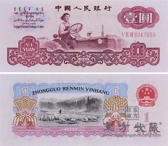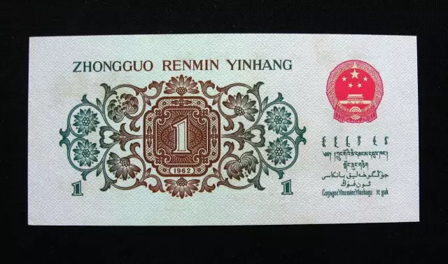 该币是1962年版1元券,1996年末停止流通。此版人民币正面为女拖拉机手,主色调为深红色,背面为天山放牧图,主色调为黑蓝黄色。双面分色,非常具有独特性,作为三版币中较珍稀的品种,其价值有非常大的上扬空间。