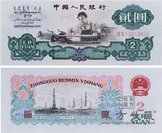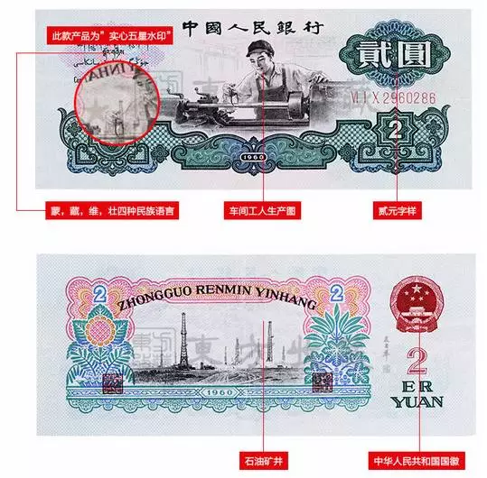 该币是1960年版2元券,1992年2月4日开始只收不付,现已基本回收销毁。其独有的空心五角星布币混合水印非常稀少,背面左下树丛中有“2”和“R”的暗记更为独特。由于2元是每个组合都需要的,因此随着纸币组合的包装成册,第三套人民币中的2元币被礼品消耗很多,其存世量自然变得尤其稀少,升值潜力非常可观。