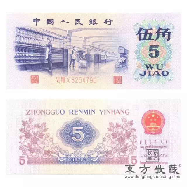 该币是1972年版5角券。1972年版5角券有凸版水印、平版水印和胶印之分,在这几种之中,平版水印较少见,因此具有一定的收藏价值。