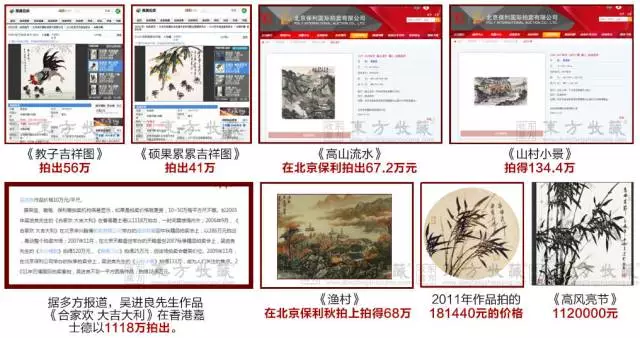 近年来,吴进良大师的作品在各大拍卖行的成交价动辄几百万甚至上千万,2005年,吴进良大师的国画作品《合家欢.大吉大利》在香港嘉士得更是以1118万人民币拍出,创造了个人作品拍卖的最高纪录。