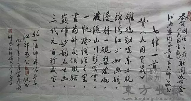 一直以来,姜增巨先生收藏书画多年,自己在书法上也颇有造诣。在活动现场感受到吴进良大师的书画魅力后,便在活动现场立刻收藏了一套吴进良大师代表作《国礼之巅·大国宝藏》。由于对大师作品爱不释手,姜先生亲作一首《七律》诗词赠予东方收藏,以表达对吴进良大师作品的喜爱之情。