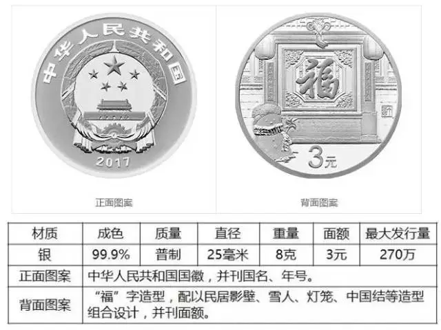 2017年贺岁银质纪念币的正面图案为中华人民共和国国徽,并刊国名、年号。背面图案为“福”字造型,配以民居影壁、雪人、灯笼、中国结等造型组合设计,并刊面额。