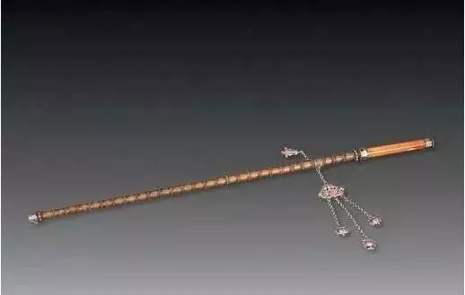 镐,亦为古兵杖之一,形式奇特,长一丈三尺,柄端安一大拳,拳握一笔,纯以铁制,其重量不亚于斧銊,旧式仪仗中时见之。