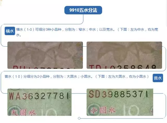 由于当时白水印仍处于半试验半实践的性质,因此从发行之初到2005年版的面世,99年版10元券的白水印一共有5个品种,在收藏界中被称之为“五水”。