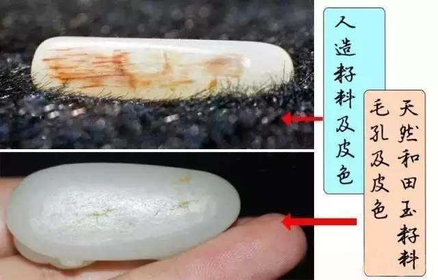 ①、看色:人造籽料,皮色颜色看上去很不自然,像浮在玉料的表面或沁入玉料的绺裂中。