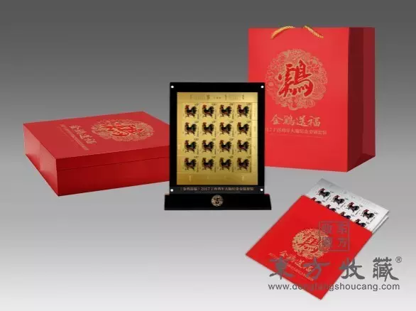 中国邮政集团公司天津市分公司以2017丁酉年两版生肖鸡票为蓝本,以999纯金1:1等比例打造,运用顶级彩金工艺,结合德国镭射微雕双面雕刻技术,创造性地将2017《丁酉年》两版邮票合二为一,正背面展示。