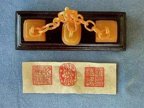田黄三连印是乾隆最后一枚印玺,乾隆做太上皇时所镌,由一整块大田黄石雕刻而成,浑然一体,甚得乾隆喜爱。