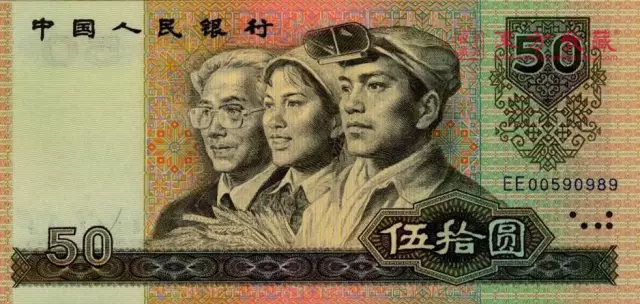 50元正面主景是工人、农民、知识分子,体现我国宪法规定的,中华人民共和国是工人阶级领导的、以工农联盟为基础的、人民民主专政的社会主义国家,以及社会主义建设事业,必须依靠工人、农民和知识分子,团结一切可以团结的力量的国体和政权性质。