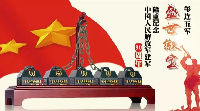 为礼献中国人民解放军建军90周年,传承红色大无畏精神,由中国国家工美协会权威监制,中国著名南北玉雕大师,“玉雕泰斗” 袁广如与中国玉石雕刻大师范同生联袂设计创作的《玺连五军盛世徽宝》隆重首发。