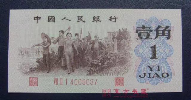 后来枣红一角因文革问题被强制回收销毁,为弥补这一空缺,随后发行了背面花纹是绿色1角钞,也就是“背绿一角”。背绿一角分带水印和不带水印两种,带水印的更稀有。