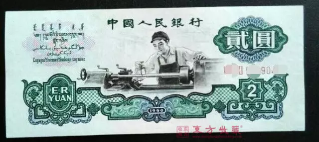 第三套中的两元钞是最早发行的,其正面是车床工人,所以被称为“车工两元”。车工两元也有两个版本,一个是实心五角星水印,另一个是空心五角星和古币混合水印,非常独特,存世量也很少。