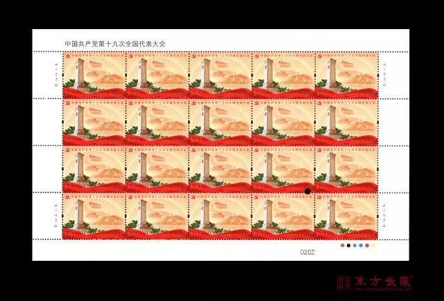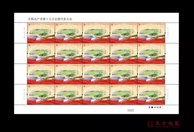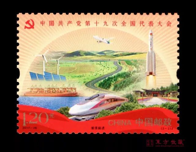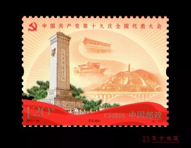 发行信息 邮票志号:2017-26 图 序 图 名 面 值 (2-1)J 不忘初心 1.20元 (2-2)J 继续前进 1.20元 小型张 筑梦 6元 邮票规格:40×30毫米 齿孔度数:13度 整张枚数:版式一 20枚、版式二 8枚 整张规格:版式一 240×150毫米、版式二 190×116毫米 小型张邮票规格:直径56毫米(圆形) 小型张外形规格:143×100毫米 小型张齿孔度数:13度 版别:影写 防伪方式:防伪纸张、防伪油墨、异形齿孔、荧光喷码 印制厂:北京邮票厂 新邮鉴赏 不忘初心 邮票“不忘初心”由人民英雄纪念碑、延安宝塔山、新华门、南湖红船等元素构成,并配以红黄相间的色调,旨在体现回眸党的历史、重温党的宗旨的主题。 继续前进 邮票“继续前进”则通过“复兴号”高铁、风力发电、太阳能、国产C919大飞机、“2017一带一路国际合作高峰论坛”主会场、火箭等元素,展现了十八大以来我国在政治、经济、科技、生态文明建设等方面取得的辉煌成就。 版式二 整体设计突出“一带一路”的重要战略,贯彻创新、协调、绿色、开放、共享的发展理念,以此体现中国共产党带领中国人民不断把实现中华民族伟大复兴事业推向前进。 小型张 小型张的图案选用天安门、华表作为主体设计元素,融入深圳、上海、杭州城市风光和国歌曲谱元素。 大版票 设计旨在体现中国共产党团结带领全党全国各族人民,锐意进取、奋发有为,为实现“两个百年”目标不懈奋斗、同心共筑中华民族伟大复兴中国梦的主题。 东方收藏您身边的投资收藏专家 典藏专线:400-821-0007.jpg)