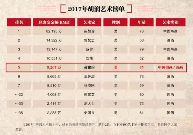 首先,我们来看一看《2017胡润艺术榜》的黄建南大师排名。