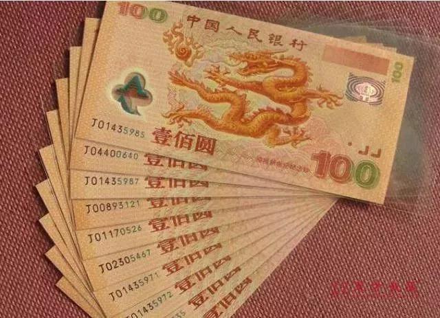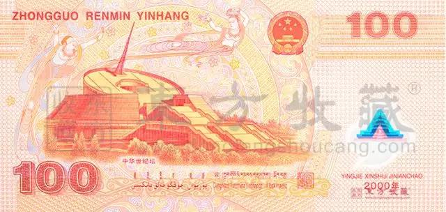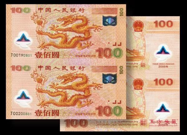 2000年又叫千禧年,是千年更替的大事件,央行为了纪念,发行了一张100元面值的塑料纪念钞,也是除香港外中国唯一一张塑料钞,制作极其精美,因其正面图案是龙,所以又被称为千禧龙钞。 展现民族特色的设计图案 平常发行的钱币,都是以风景、建筑、人物为票面的主景,而千禧龙钞则是以中华民族的图腾龙作为主景,用举世闻名的敦煌飞天造型来衬托,展现了中华文化的源远流长。 正面主景上的这条龙,原型是北京北海九龙壁中左侧第三条升龙。北海九龙壁是我国殿宇影壁中的精华,翻腾飞舞的龙具有高超的艺术水平,用在纪念钞票中作为主体,既生动又新颖。 但九龙壁中的这条龙是面朝右边的,为了票面构图的需要,就镜像后使其面朝左边,并将其横向拉长,龙尾伸出胶印纹饰,右侧上爪紧贴OVD全息膜。金黄的色调使票面色彩艳丽明快,一条黄金龙腾空而上,气势磅礴。 背面主景图案为迎接新世纪的代表性建筑中华世纪坛,中华世纪坛上空,乾坤台圆盘上,时空指针的左右,别具心裁地各安置上一个敦煌飞天的图案,底纹也有敦煌藻井图作衬景,显得简洁、大方、庄重,富于时代感。 透明视窗则以一朵梅花云为造型,像一扇玻璃窗户,明亮洁静,在窗户的中上部,采用了金粉、天蓝、桃红三色重叠,印上巍峨壮美的北京天坛祈年殿。 全息激光防伪标志以一个抽象的飞翔风筝为造型,中央印有一盏大灯笼,上印“千年”的字样,在灯笼吊须的左右端,各印有“2000”字样,随着角度方向的变换,标志会呈现出红、黄、蓝、绿的幻彩。 票面正面右上角的“100”字样,采用了光变面额数字技术,与票面垂直的角度观察为金色,倾斜一定角度则变为绿色。