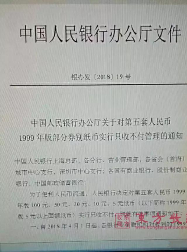 最近钱币圈子里突然掀起了一场轩然大波,而当小编了解到这件事情的时候,也着实震惊了一把,那就是99版人民币将从今年4月1日开始,只收不付! 上面就是网传的那份文件公告,不过早在流传之初,大家倒是都不怎么相信,而且据说有人找遍了中国人民银行官网,都没有找到任何相关的信息,难道这个文件真是假的吗? 有资深的藏友分析了这其中的几个疑点,像截图通告是电脑文档翻拍的、当地银行的发行科表示没有收到此文件、四版币都还没有下发只收不付的正式文件等等,言之有理,小编也很难相信文件的真实度了。 然而令人意外的是,就在前几天,从银行内部再次流出了关于这份通告的消息,经证实,的确存在这份文件,很多人都亲眼见到了,所以99版人民币只收不付,得以盖棺定论! 行情看涨在即 99版人民币对我们来说,确实是非常熟悉的人民币品种,而且作为新世纪革故鼎新、技术大变革的一版人民币,99版人民币里有很多很有意思、非常独特的品种,极具潜力,收藏价值不容小觑! 此次坐实只收不付的消息后,可以确信的是,未来99版人民币会越来越少见,逐渐淡出大家的视线,而会作为收藏品,活跃在收藏市场上,其价值也会与日俱增,尤其是其中那些本就珍贵罕见的品种。 发行时间短,回收快,存世量少 99版人民币发行时间很短,主要是因为99版人民币里,除了1元纸币,其它几种面值的纸币,背面都缺少拼音“yuan”,成了大家公认的“错版”币,而且也不利于人民币走向国际市场,所以被早早回收了。 因为回收的很快,再加上发行时间有限,所以99版人民币的发行量并没有我们想象的那么多,经过这些年流通消耗,存世量也不算太多,现在除了少数的100元和1元纸币外,其他面额已经很难见到了。 工艺高超,屡创奇迹 99版人民币发行的时间,正好是我国科技和经济实力腾飞的时期,所以在印刷工艺和防伪工艺上,大幅提升了工艺水平,防伪工艺技术甚至能与世界顶级印钞技术相媲美。 首先在荧光技术上,不同于第四套以前的大面积、较为粗糙的荧光图案,99版人民币的荧光图案都非常精致细腻,几乎完美贴合原本的图案设计。 其次就是版别,单单99版10元的数字水印,就有窄水、宽水、中水、大圆水、小圆水,足足五种不同的水印,更别说还有红一、双红一、双冠双红一、三红一、四红一等不同版本的冠号了。 其实在收藏市场上,99版人民币一直都是热门品种,尤其是2011年初的99版封库事件,更是把99版的行情推到了最高点。 目前,一张全品相的99版50元,价格已经翻了三倍,而99版10元的那些罕见版本,价格也都超过百元,所以很多人都很看好99版这个潜力品种的后市升值空间。
