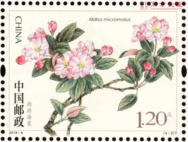 邮票志号:2018-6 发行日期:2018-03-25 图序/图名/面值 (4-1)T楸子1.20元 (4-2)T西府海棠1.20元 (4-3)T河南海棠1.20元 (4-4)T三叶海棠1.20元 邮票规格:40×30毫米 齿孔度数:13度 整张枚数:版式一16 枚、版式二8枚 整张规格:版式一200×150毫米、版式二130×190毫米 版别:胶雕套印 防伪方式:防伪纸张、异形齿孔、荧光喷码