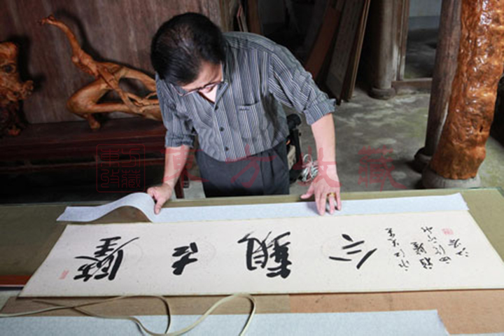 有两种方法。一为卷存,即在书画的下面衬一层幅面比书画幅面稍大的宣纸,以报纸卷为轴,将书画卷成卷,要卷得熨帖,防止出现褶皱、打叠或边际不齐,再以报纸包裹,置于画盒内;二为展存,即先将每幅书画芯下面各衬一层宣纸,一一相摞平铺于案板上,大幅面在下,小幅面在上,再在上面覆盖几层报纸,并加盖塑料膜,不宜压以重物。此法对书画最为有益,但较占地方。书画切忌折叠存放,因折叠存放,不经数年便会在折处出现断裂或留下黑色折痕,装裱时很难去除。