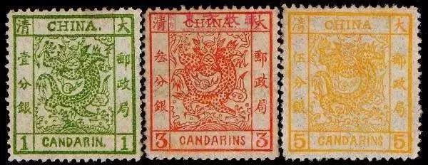 1878年(清光绪四年),清代海关试办邮政,中国开始发行第一套邮票——“大龙邮票”。邮票上“大清邮政局”5个字十分醒目,图案中的“大龙”两目圆睁,腾云驾雾,呼之欲出。上方标有“CHINA(中国)”,下方标有“CANDARINS(海关平银、分银)”字样。