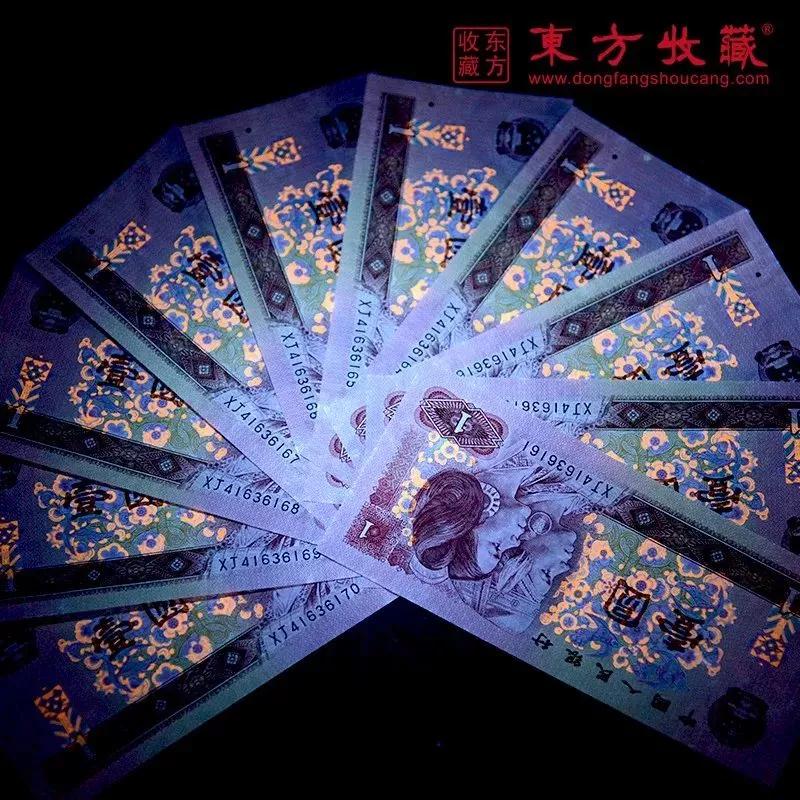 举一个例子,四版币一角荧光青天背祥荧光钞现在单价120元,较面值涨1200倍,而普通的一角币也就几角钱一张。提醒:荧光纸币需要使用365nm的紫光灯才能显示出效果。