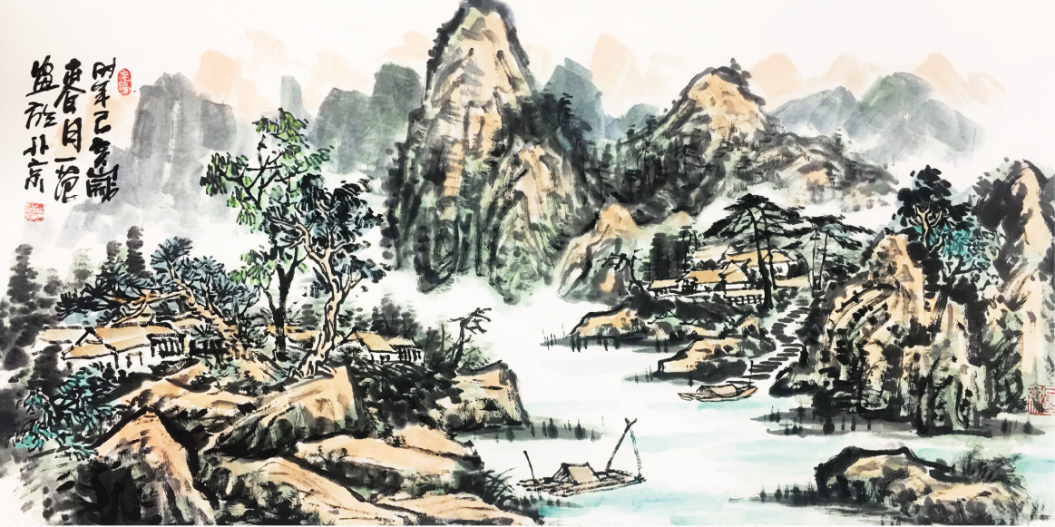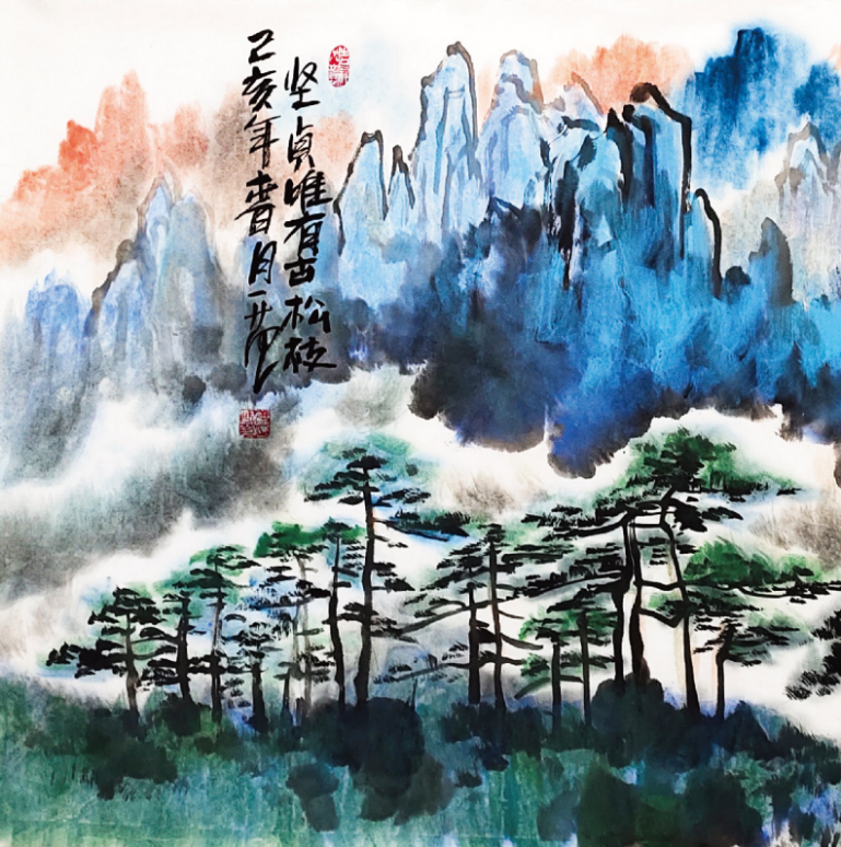 而正是在此时,姜国华在黄山遇到刘海粟大师,并拜刘海粟为师,学习泼彩技法,可以说是在刘海粟艺术最为成熟的关键时刻,得其真传。这与他本身豪爽的性格相得益彰,形成了其“大开大合、纵而能敛”的大写意泼彩山水画风格。