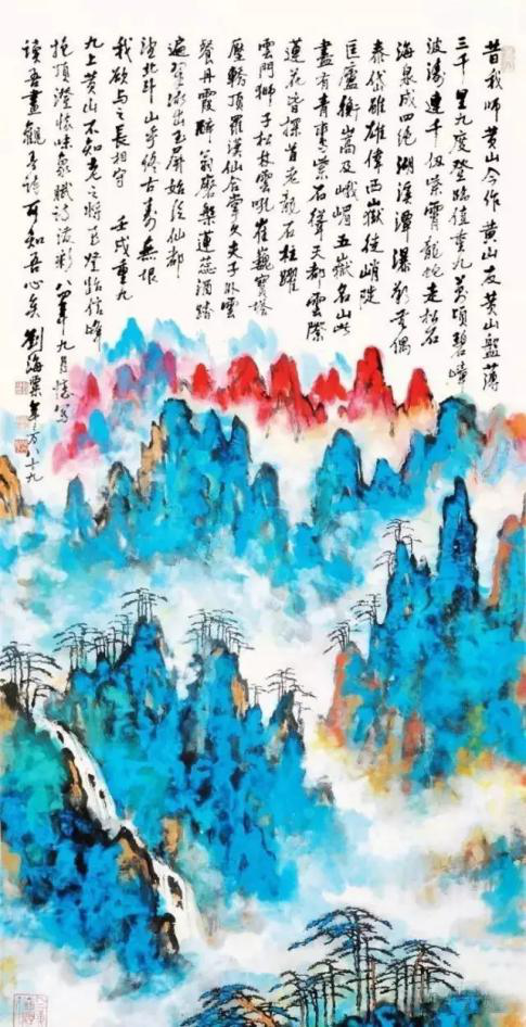 刘海粟大师曾经十上黄山,1981年第八次上黄山,此时的他已是八十多岁的老人了,他的艺术也在新时代里迎来了新的春天他创作了大量泼墨、泼彩黄山图,手法上以骨法用笔的中锋线条构建骨骼,用墨或彩泼洒晕染以助韵,兴会所作常常笔墨酣畅,气势夺人,此时作品已真正代表了他的艺术风格,可以说是他一生艺术实践与人生体验的自然结果——“人画俱老瓜熟蒂落应为成熟期。