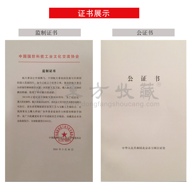 东方收藏承诺遵守商业道德,诚信为本、依法经营,接受会员监督。东方收藏所有藏品均有相关机构出具的证书,如果您发现虚假藏品,即可假一赔十。