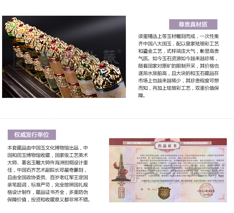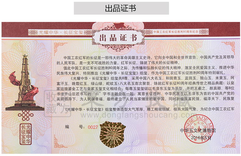 东方收藏承诺遵守商业道德,诚信为本、依法经营,接受会员监督。东方收藏所有藏品均有相关机构出具的证书,如果您发现虚假藏品,即可假一赔十。