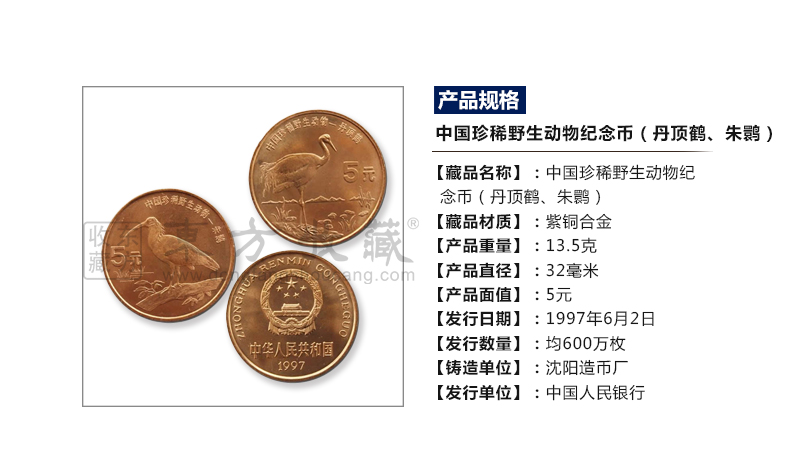 中国珍稀野生动物纪念币 1997年丹顶鹤与朱鹮