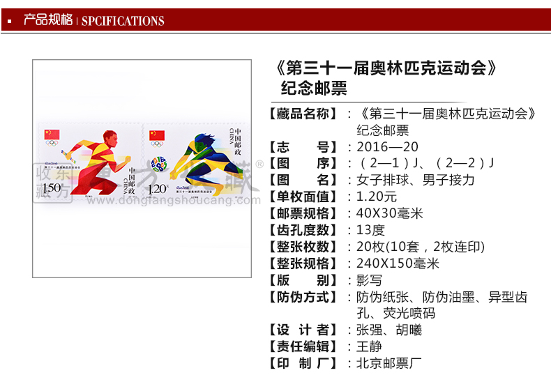 《第三十一届奥林匹克运动会》纪念邮票 一套2枚 2016里约奥运会邮票 邮费自理