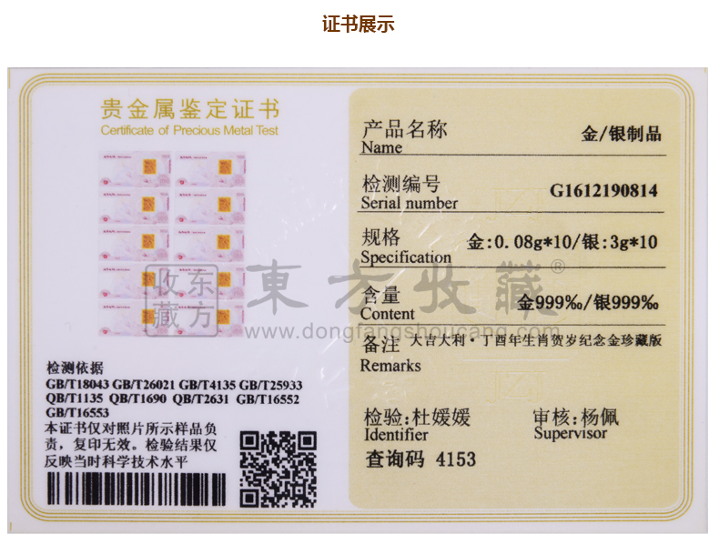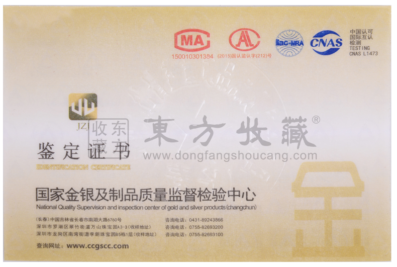 东方收藏承诺遵守商业道德,诚信为本、依法经营,接受会员监督。东方收藏所有藏品均有相关机构出具的证书,如果您发现虚假藏品,即可假一赔十。