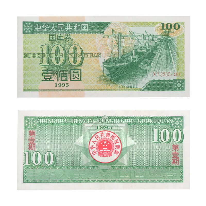 中国国库券 1995年100元(第一期) 山东石臼港媒码头 全品