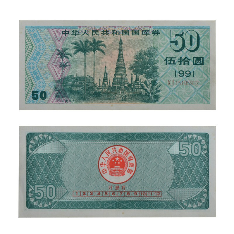 中国国库券 1991年50元 云南风光 全品