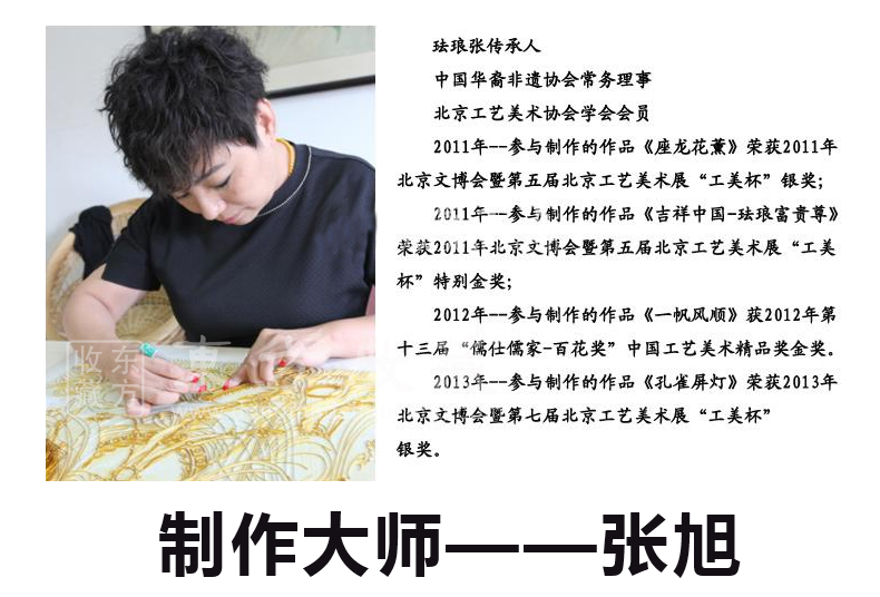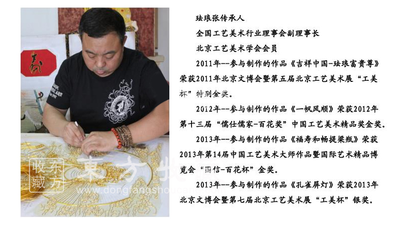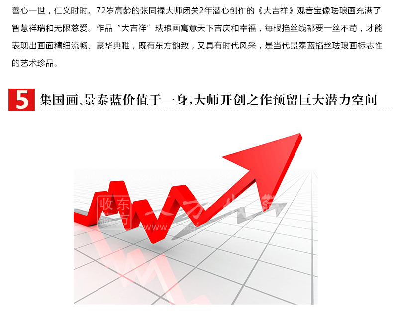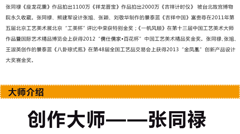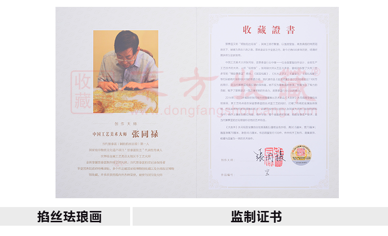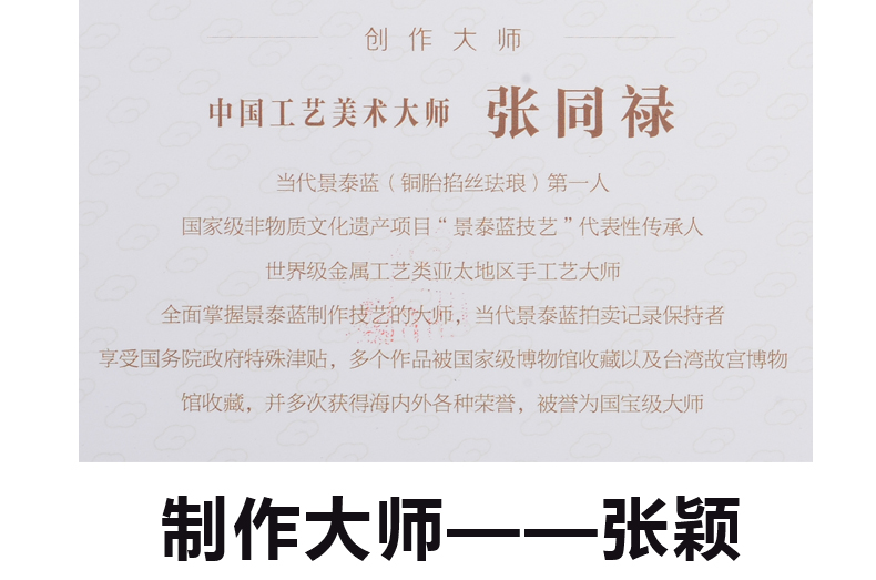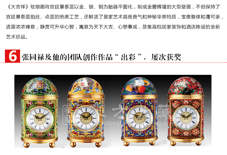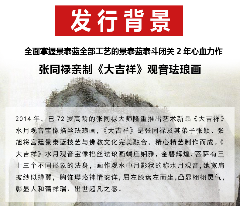 2014年,已72岁高龄的张同禄大师隆重推出艺术新品《大吉祥》水月观音宝掐丝珐琅画,《大吉祥》是张同禄及其弟子张颖、张旭将宫廷景泰蓝技艺与佛教文化完美融合,精心精艺制作而成。《大吉祥》水月观音宝像掐丝珐琅画端庄娴雅,金碧辉煌,菩萨有十三个不同形象的法身,画作观水月影状的称水月观音,她宽肩披纱似蝉翼,胸饰璎珞神情安详,屈左膝盘坐而坐,凸显栩栩灵气,彰显人和蔼祥瑞、出世超凡之感。