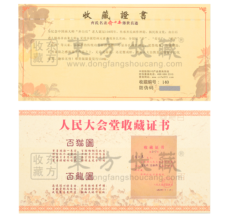 东方收藏承诺遵守商业道德,诚信为本、依法经营,接受会员监督。东方收藏所有藏品均有相关机构出具的证书,如果您发现虚假藏品,即可假一赔十。