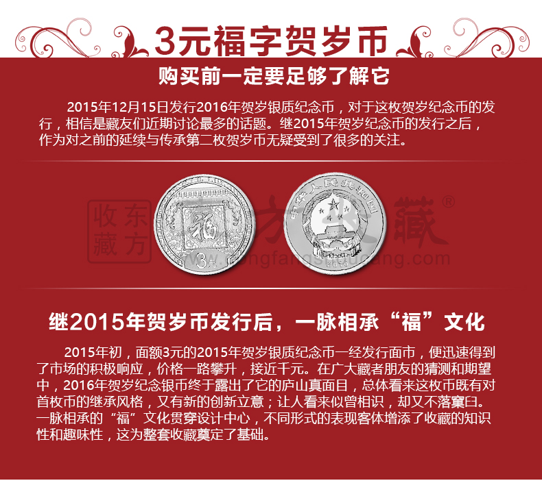 2016年贺岁银质纪念币 2016福字币 3元面值 福字银币 8克银