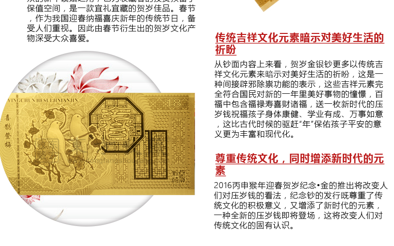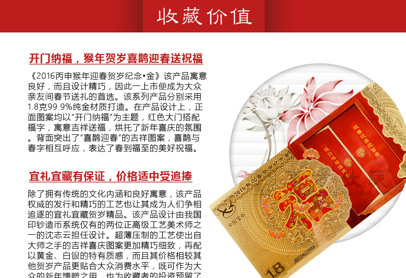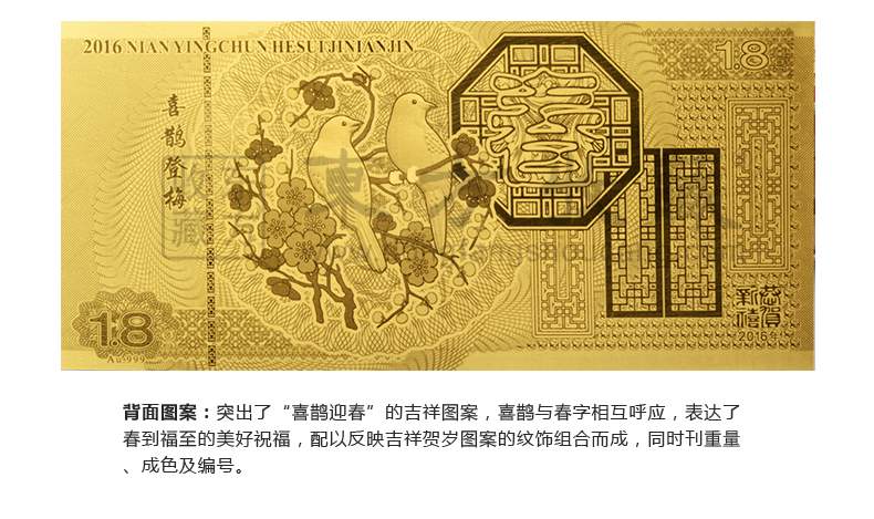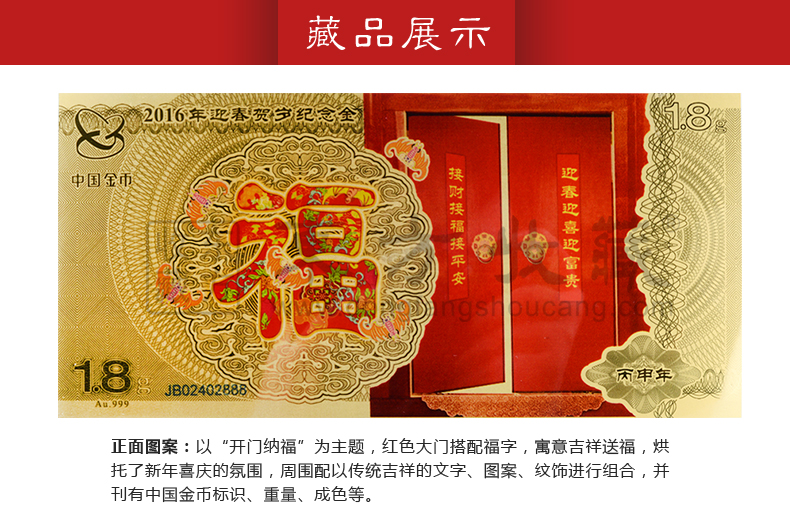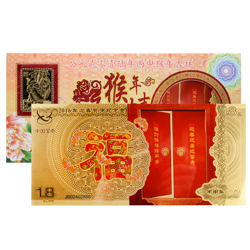 《2016丙申猴年迎春贺岁纪念金》该产品寓意良好,而且设计精巧,因此一上市便成为大众亲友间春节送礼的首选。该系列产品分别采用1.8克99.9%纯金在产品设计上,正面图案均以“开门纳福”为主题,红色大门搭配福字,寓意吉祥送福,烘托了新年喜庆的氛围。背面突出了“喜鹊迎春”的吉祥图案,喜鹊与春字相互呼应,表达了春到福至的美好祝福。