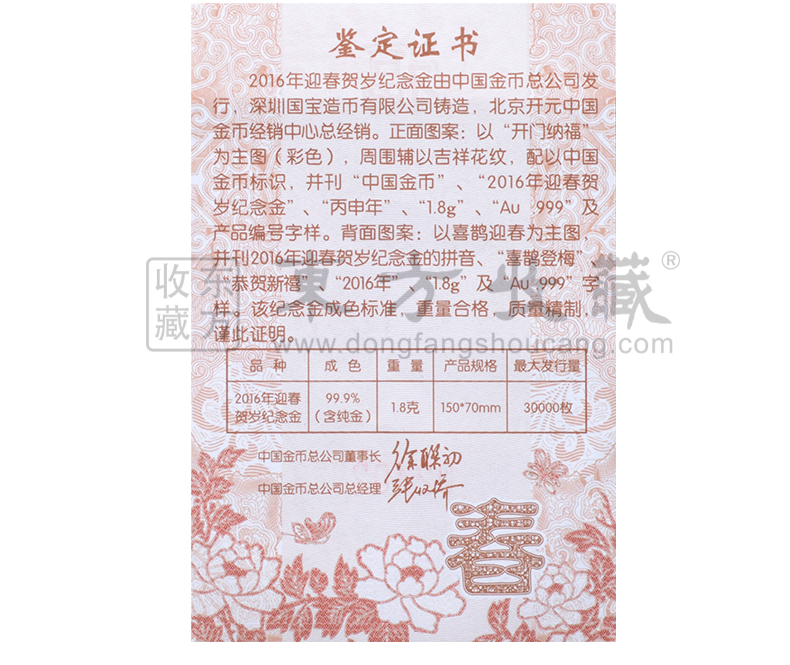含99.99%纯金1.8克,150mm X 70mm,限量发行30000枚