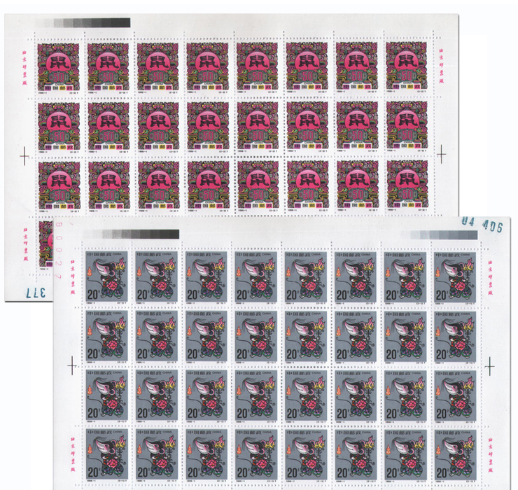 中国邮政定于1996年1月5日发行《丙子年》鼠票,全套2枚。邮票由吕胜中设计,李庆发、姜伟杰雕刻。