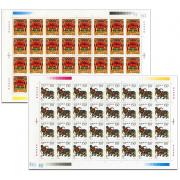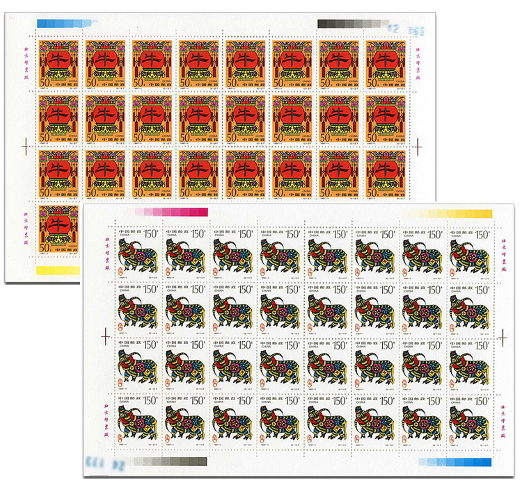 中国从1992年开始发行第二轮生肖邮票,每年发行两枚生肖邮票,到2003年止共发行24枚生肖邮票。中国邮政在1997年1月5日发行了第二轮生肖邮票丁丑牛年大版票。该大版票包括面值“金牛奋蹄”邮票和“牛耕年丰”邮票各一版,每版32枚。“金牛奋蹄”面值为150分,发行量为:8281万枚;“牛耕年丰”面值为50分,发行量为:9347万枚。两枚邮票设计、雕刻:呼振源,剪纸:齐秀花。北京邮票厂印刷,影雕套印。