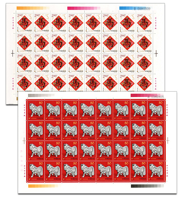 第一枚图案选用陕西宝鸡凤翔县泥塑玩具马,这是继1995年陇县民间工艺品枕头猪被选进生肖邮票以来,宝鸡民间工艺品第二次出现在生肖邮票上。底色为大红色,马身为黑花色,内含多种吉祥元素。